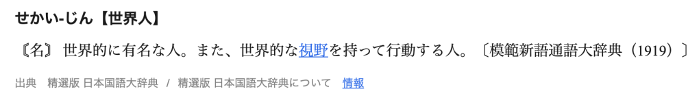 〘名〙 世界的に有名な人。また、世界的な視野を持って行動する人。〔模範新語通語大辞典(1919)〕