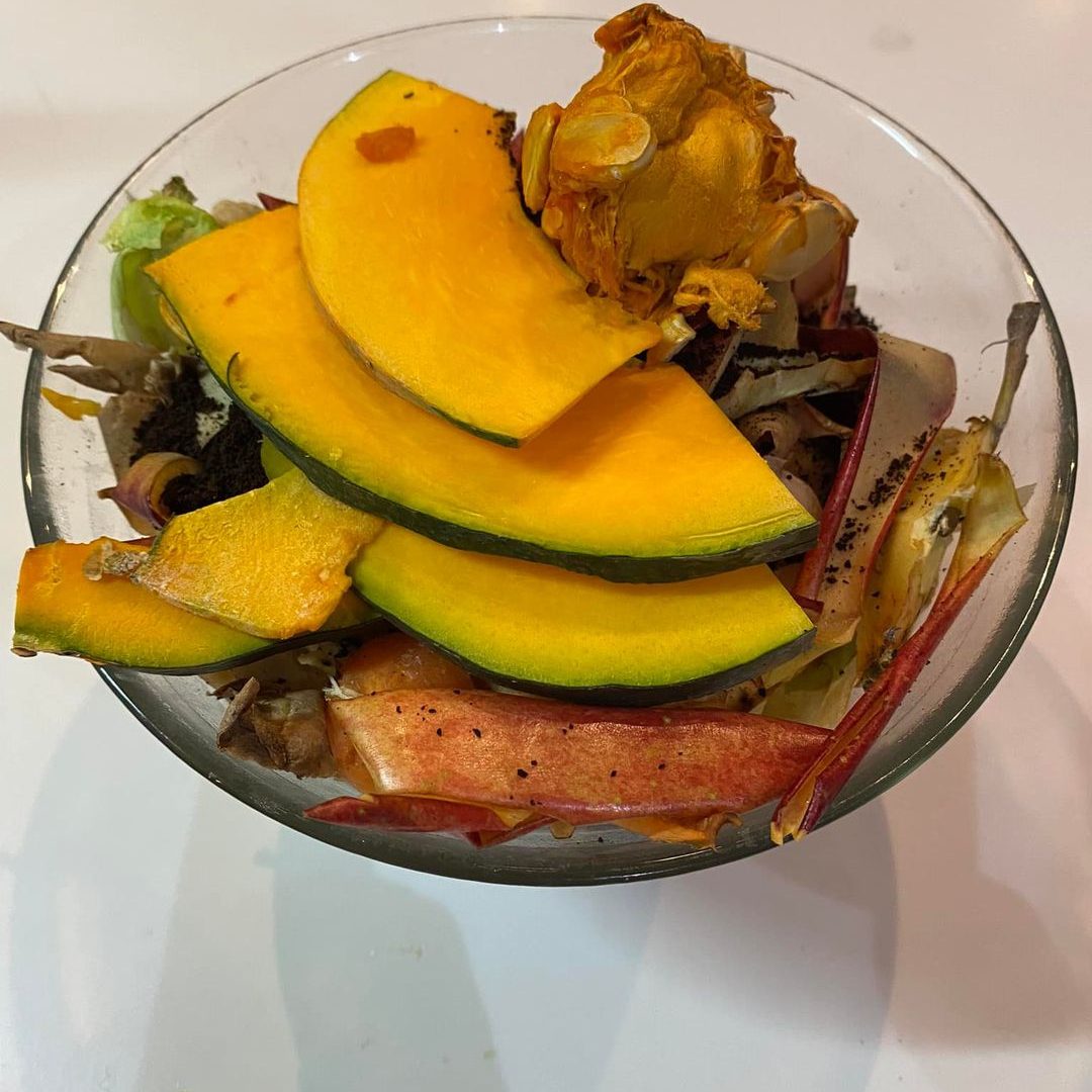 このガラスの器に生ゴミをぽいぽい入れて溜めて、キエーロに投入します