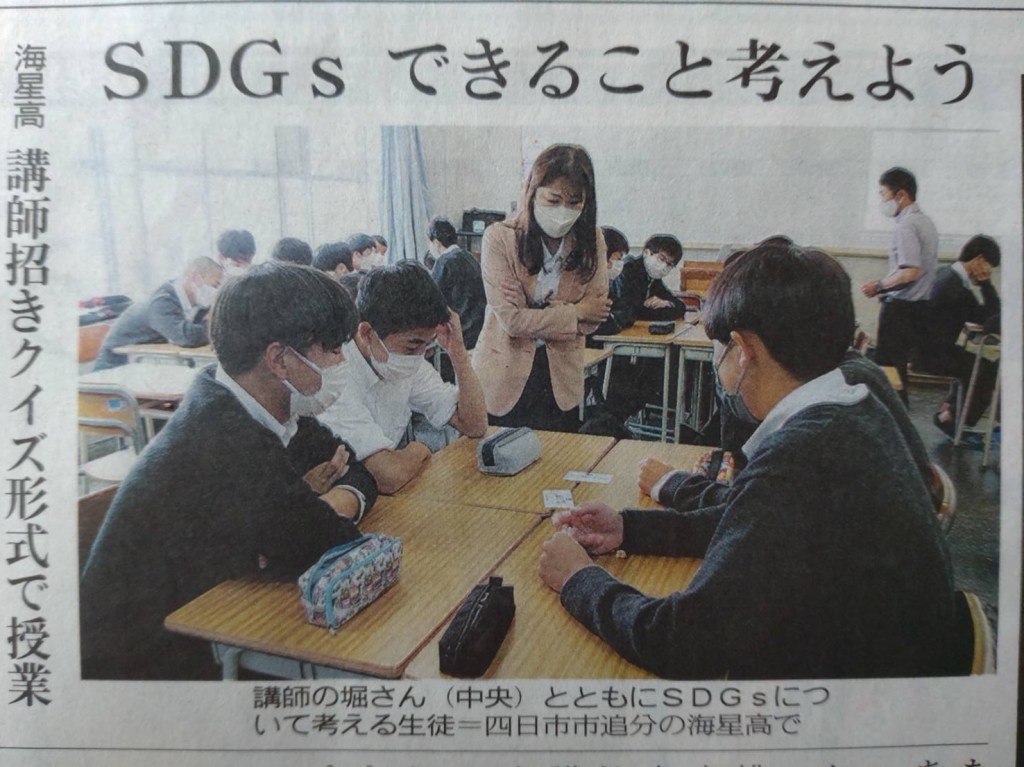 生徒の皆さんは、中学校の時にSDGsについて学んでから高校にやってきます。そこで海星高校さんでは探求学習を取り入れ、SDGsを通じて、自分・地域・日本社会・世界について深く探求されるようです。私たちのお話は探求学習をスタートする前に、四日市のことを事例にクイズ形式にして、身近にSDGsを理解して頂くための講座になっています。