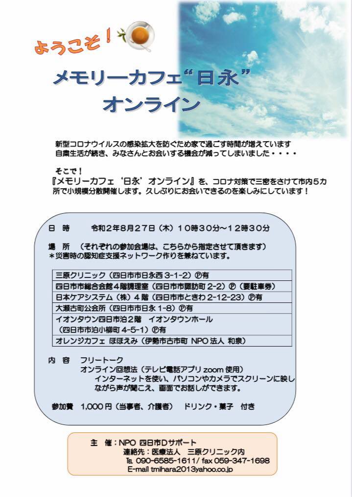 先日、NPO法人Dサポートさん主催のメモリーカフェ”日永”オンラインに参加させていただきました。