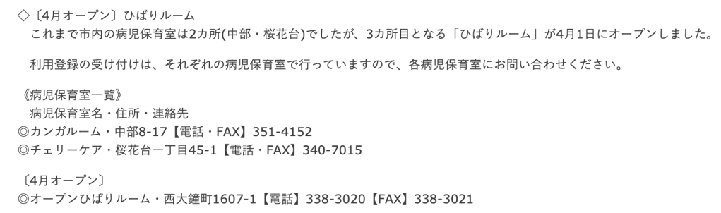まだ広報には掲載されていませんが、下記の病児保育に加えて貝沼内科さんが来年度からスタートされます。