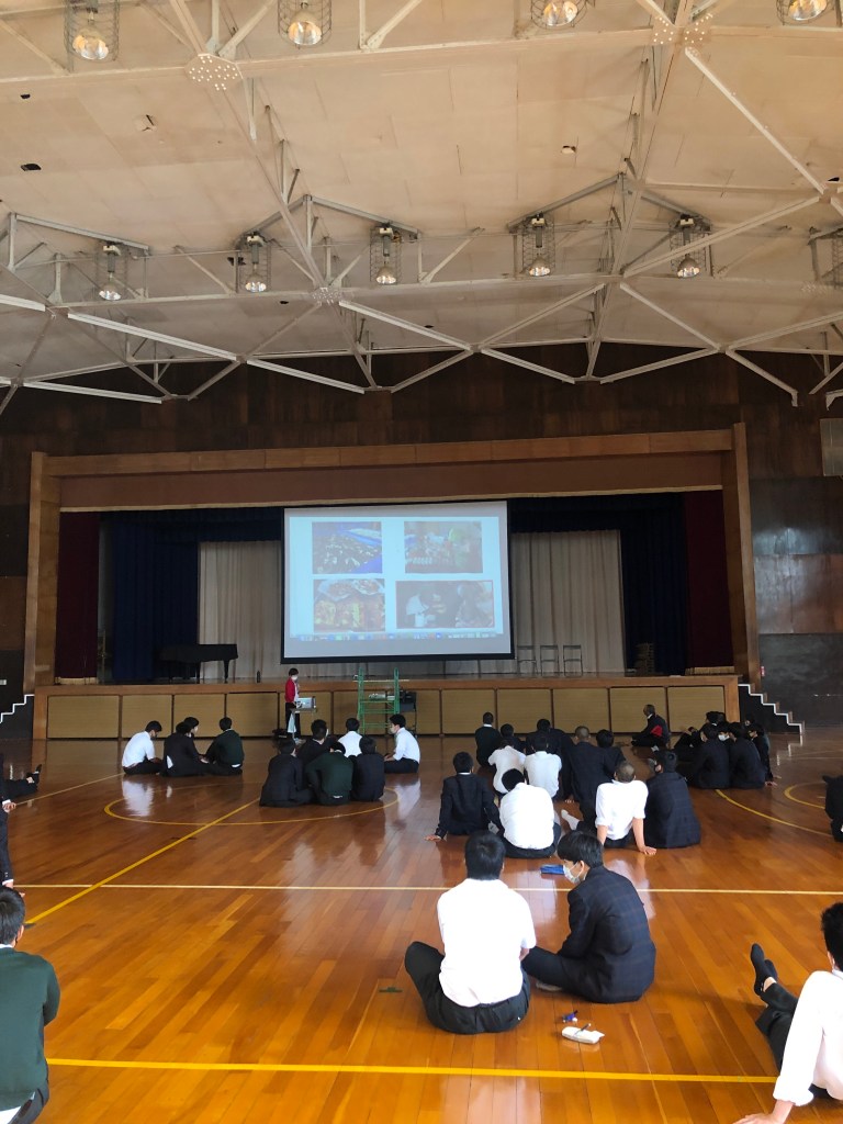 このコロナ禍においてソーシャルディスタンスを保ちながらの授業ということで、先生方が教室の配置をご検討くださいました。私は体育館でもお話しさせていただきました。