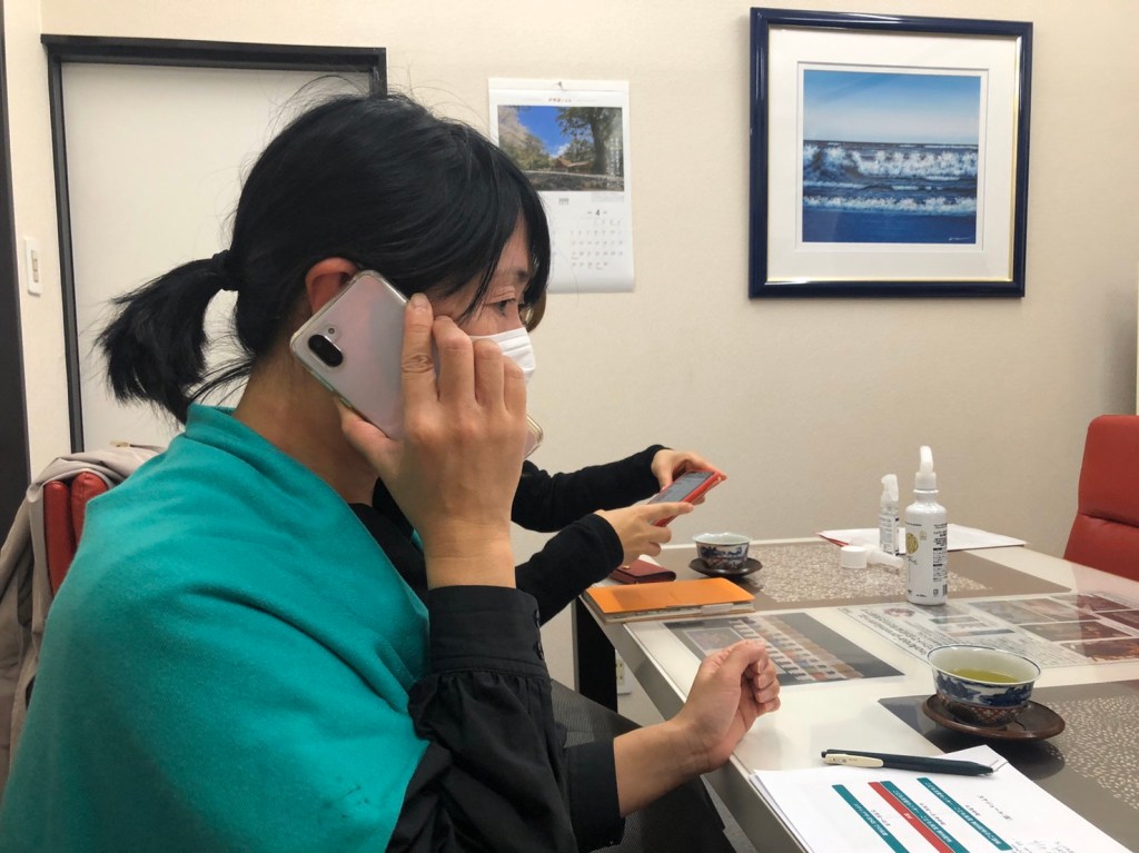 ピーキューテクノさんの会議室でとある方と電話をする古市(隠し撮りしたのは、なるかわ)
